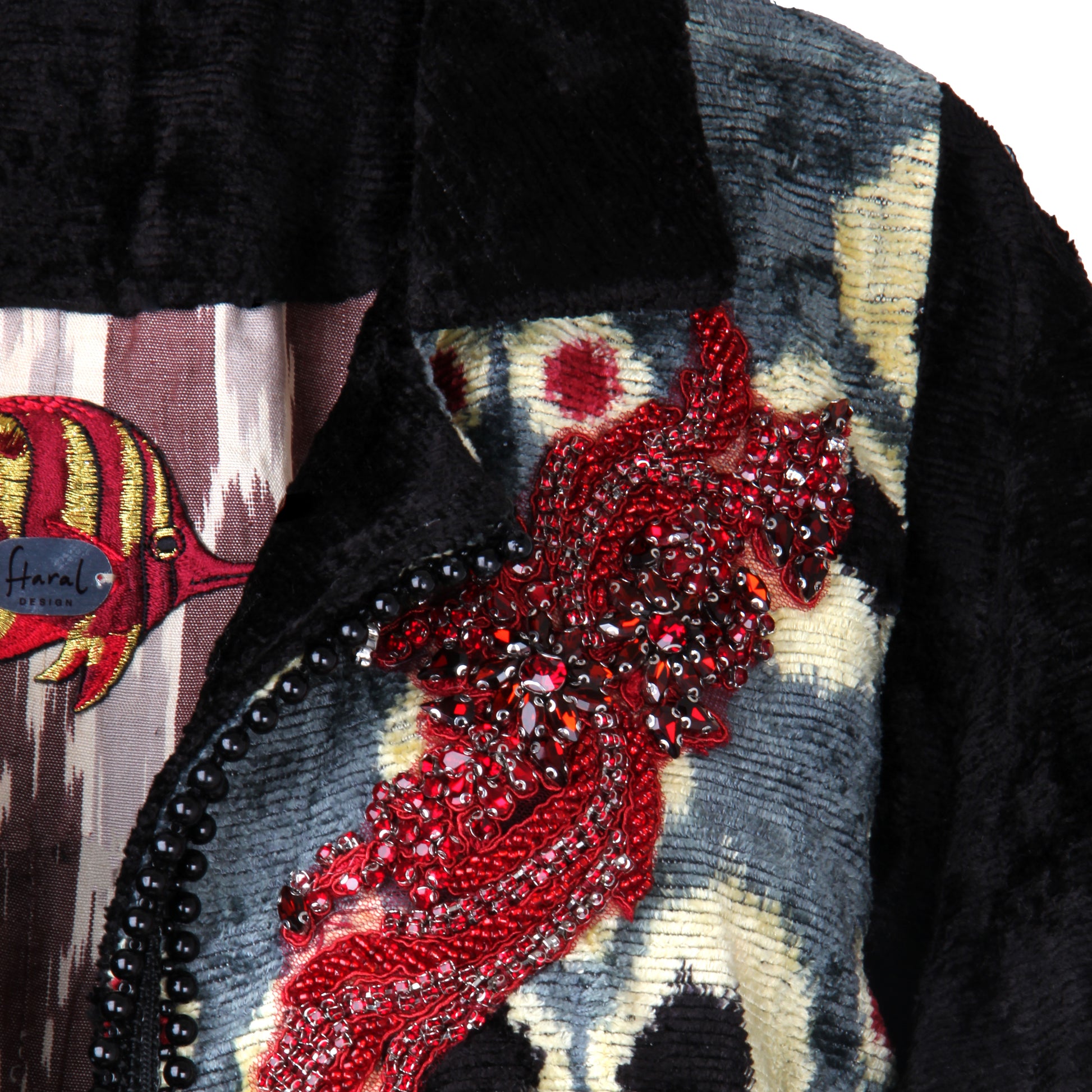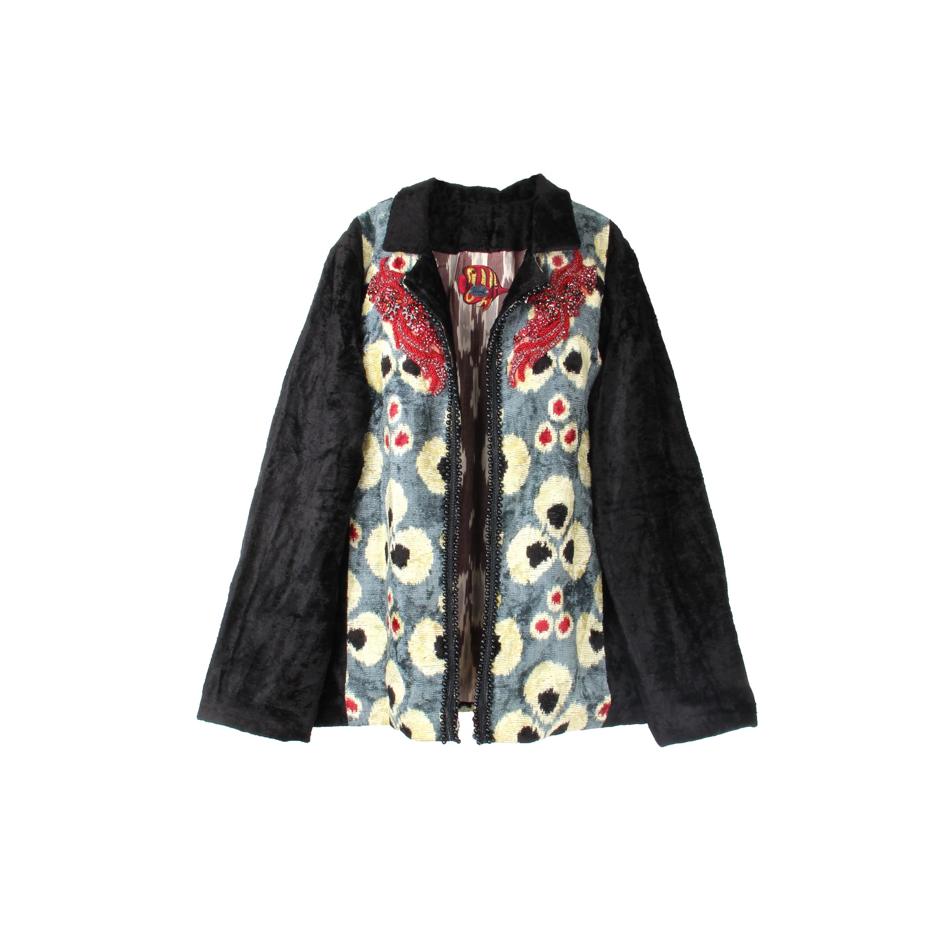 Crafted from luxurious velvet and finished with an ikat-lined interior, the jacket offers structure, comfort, and a discreet layer of distinction. Its concise proportions and elevated finish make it a versatile statement piece—ideal for refined daytime wear or sophisticated evening settings.