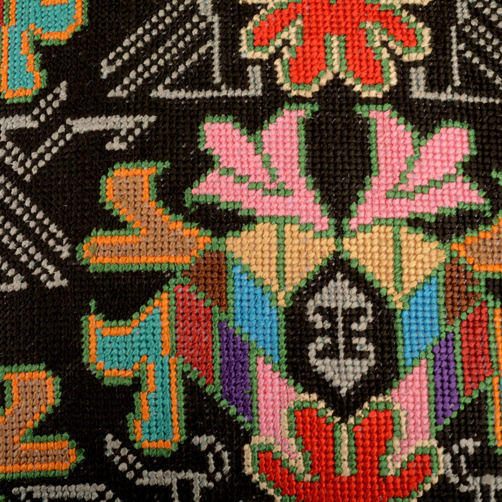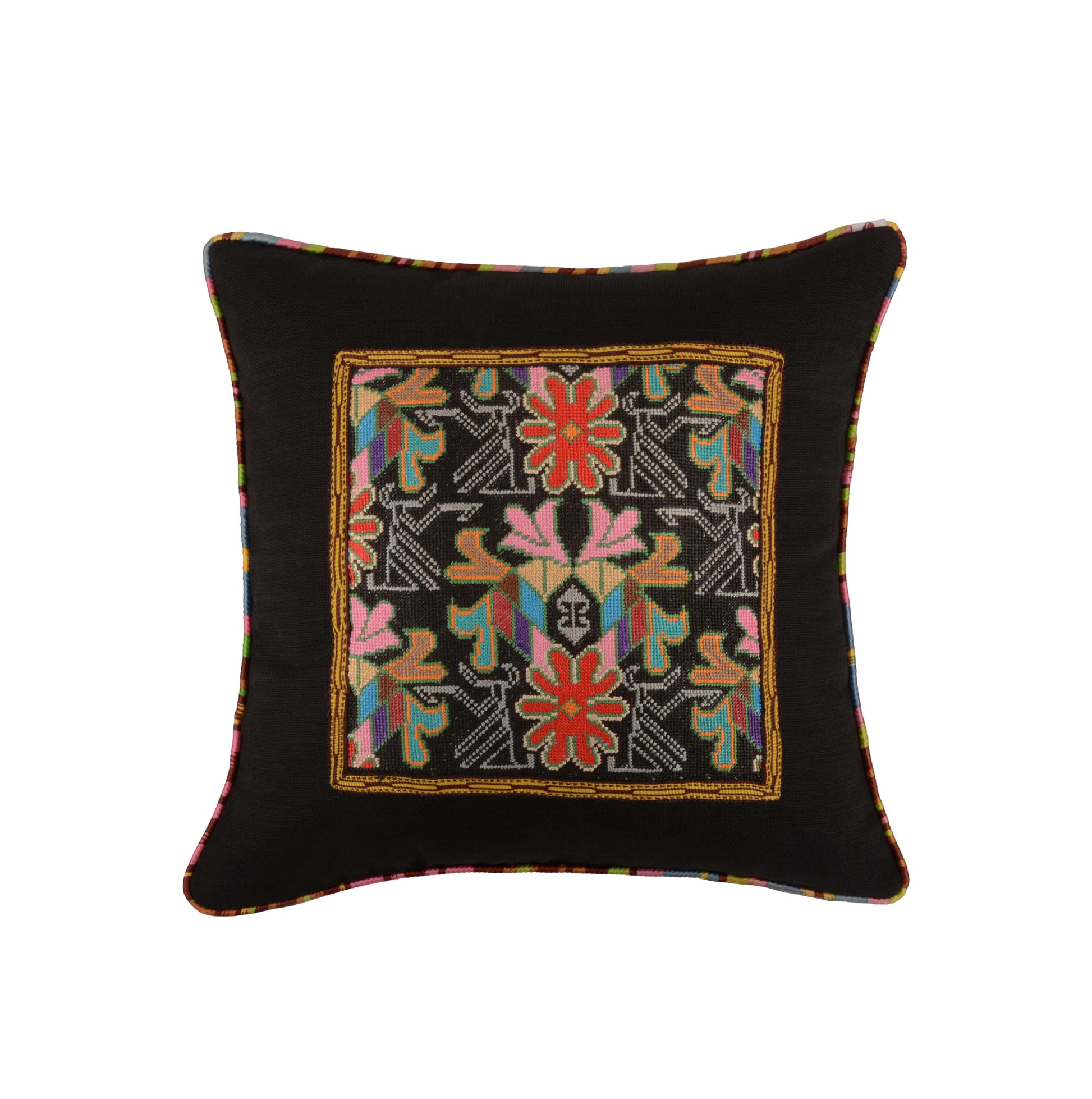Coussin Taurus avec motifs tissés à la main ouzbeks Sur le coussin Taurus, les motifs tissés à la main ouzbeks se marient avec une bordure colorée sur un tissu noir.
