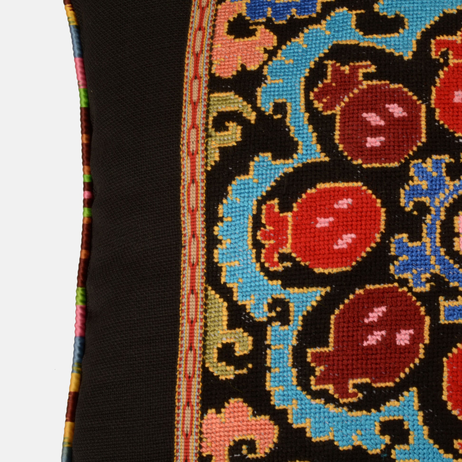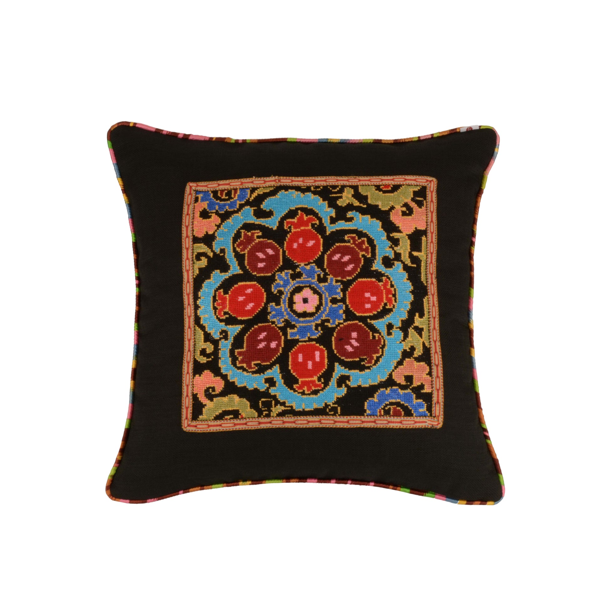 Melagrano présente un oreiller noir avec une broderie à la main ouzbèke et un motif central, combiné à une bordure colorée.