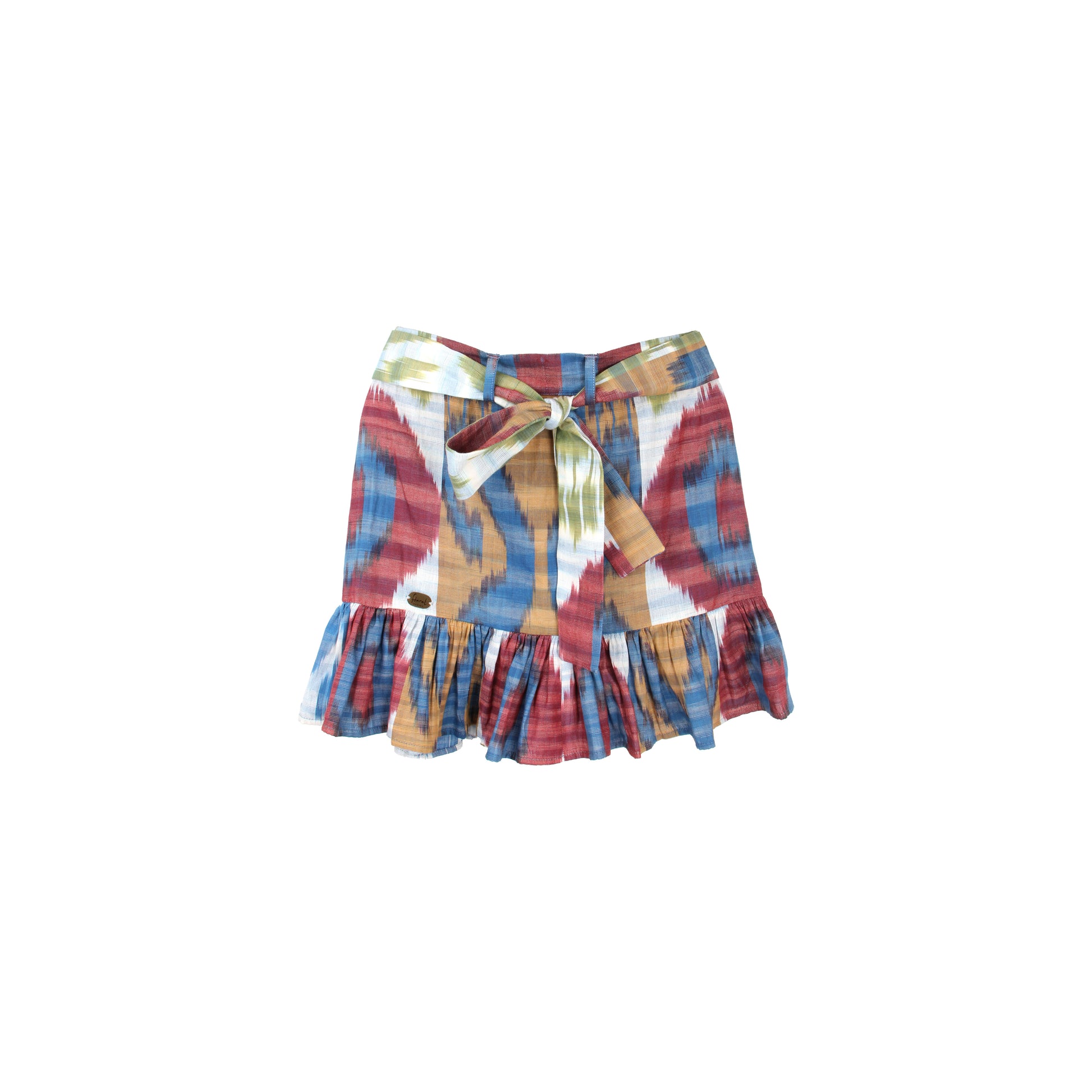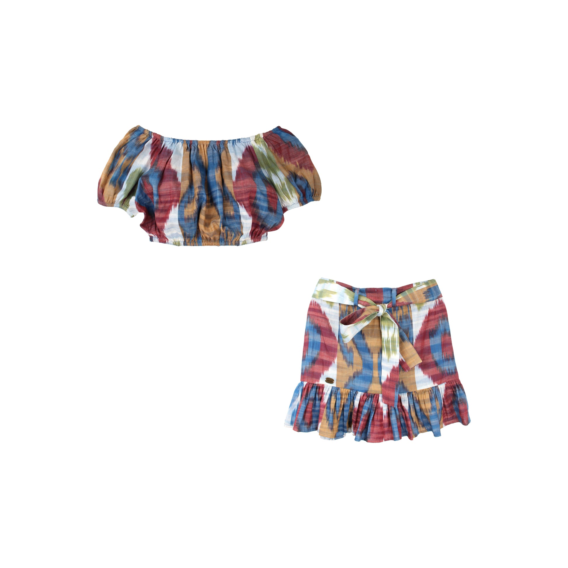 This cotton ikat skirt and blouse set blends the natural texture of premium cotton with the timeless beauty of traditional ikat weaving. The breathable cotton fabric ensures all-day comfort, while the signature ikat color transitions add an elegant, artistic touch to the design.