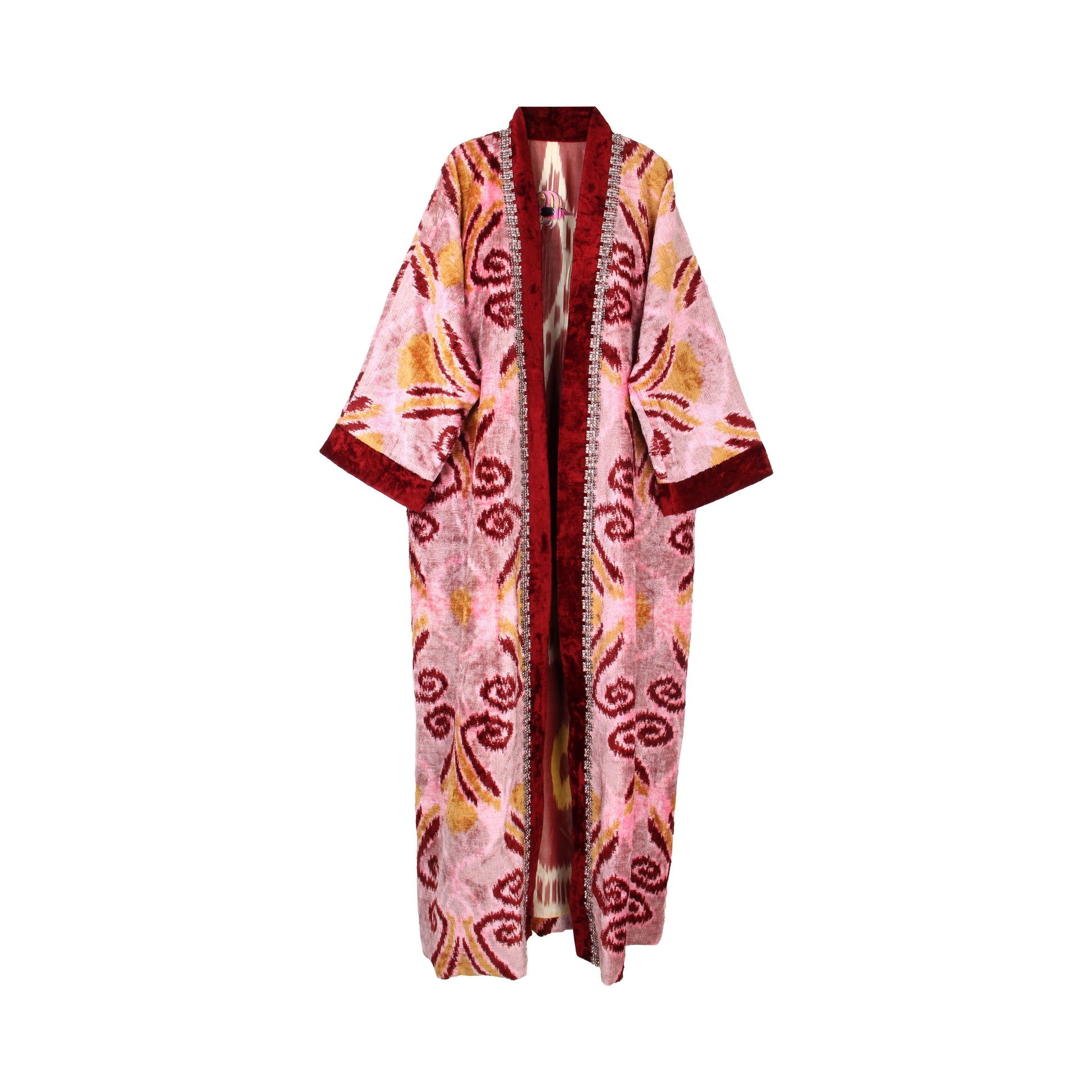 Crafted from luxurious velvet ikat and fully lined for comfort and structure, the kaftan is elevated by precisely applied crystal details that add a subtle, sophisticated brilliance. Designed as an exclusive creation, it offers a timeless statement of individuality and modern elegance.