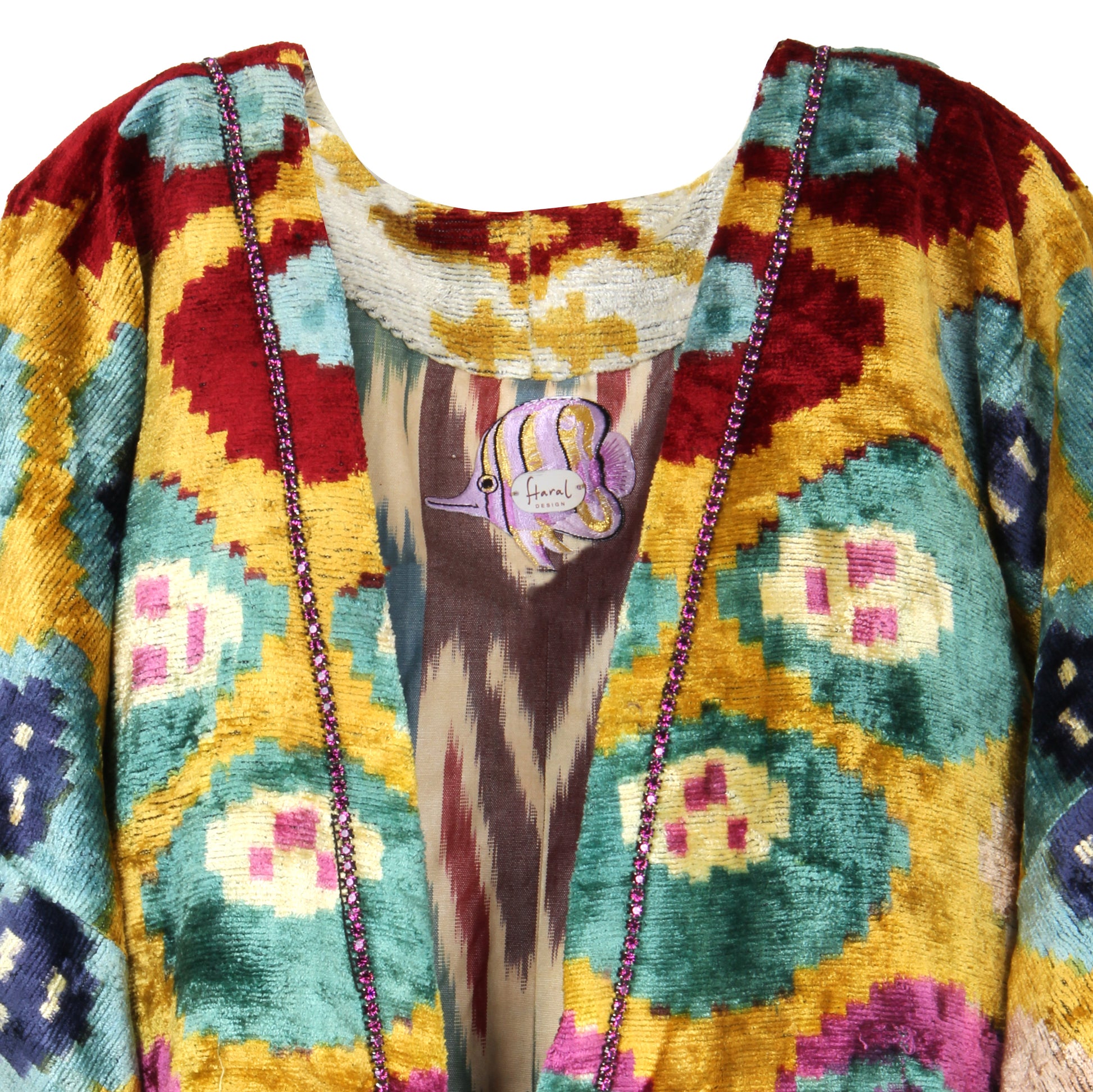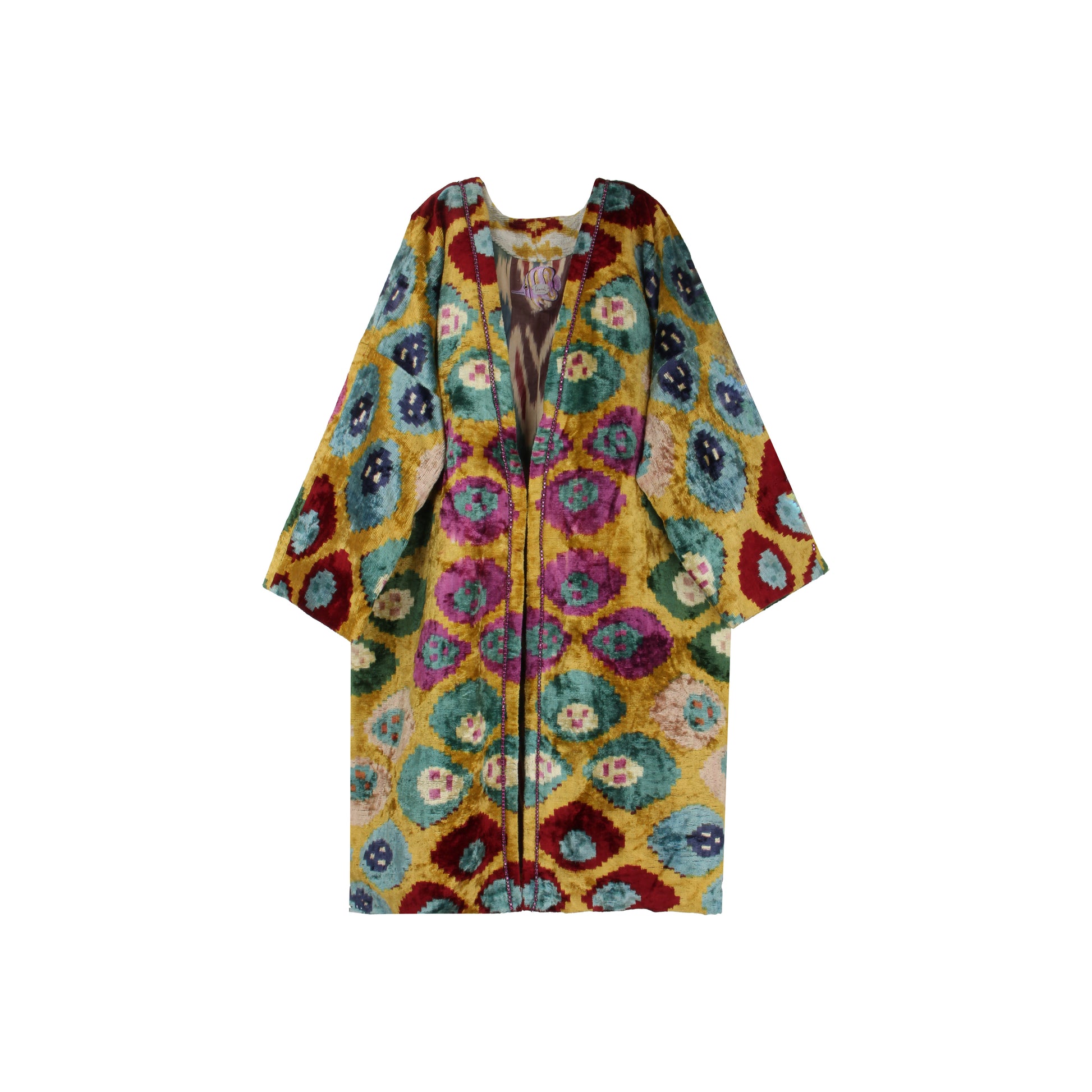 Crafted from luxurious velvet ikat and fully lined for enhanced comfort and structure, the kaftan features meticulously hand-applied crystal details that accentuate its artisanal character. Produced as a single exclusive piece, it offers a distinctive presence defined by individuality, elegance, and timeless appeal.