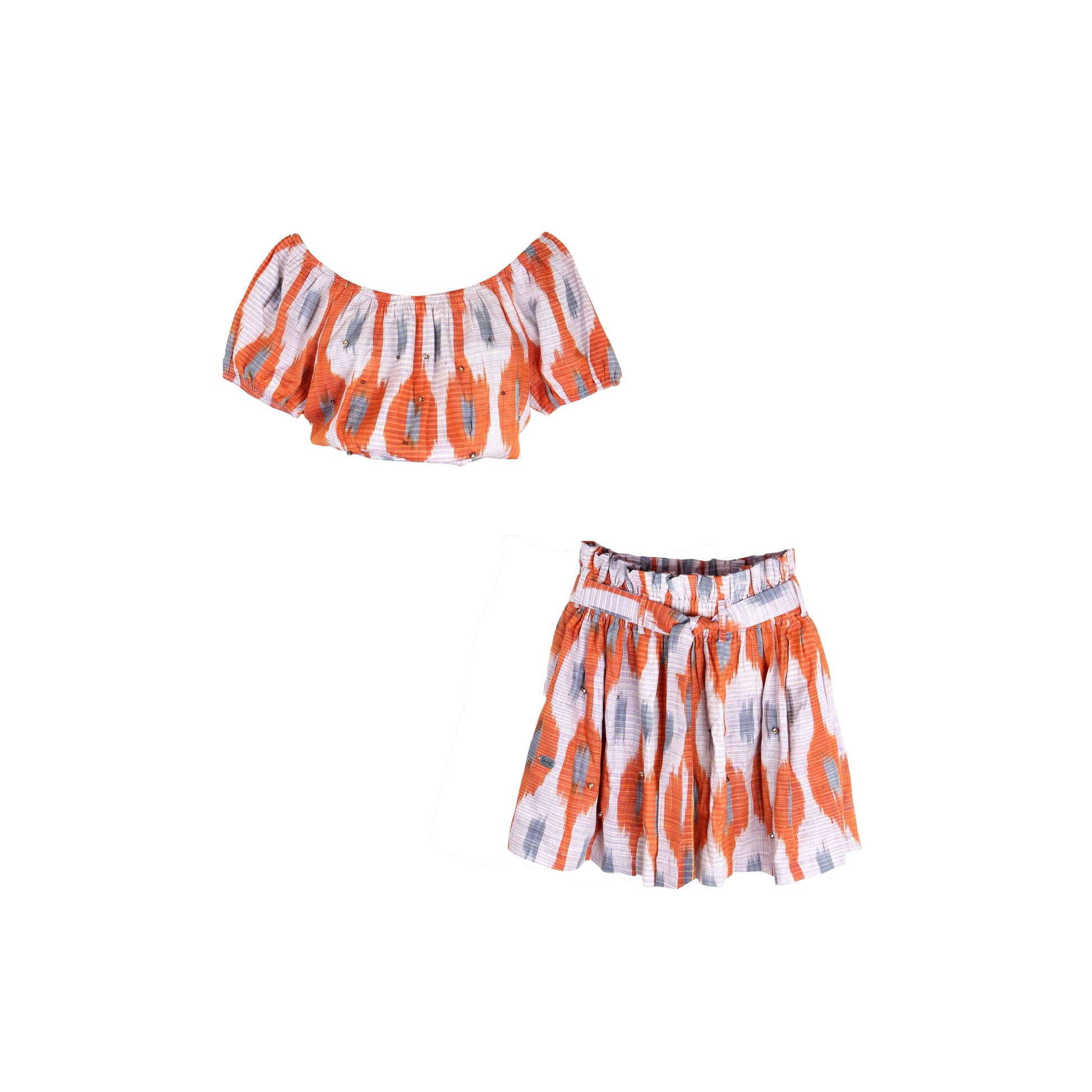 This sophisticated ikat-patterned cotton blouse and skirt set is elevated with shimmering Swarovski embellishments, blending traditional ikat artistry with contemporary luxury. The rich texture of cotton ikat is thoughtfully highlighted through meticulous craftsmanship and refined detailing.