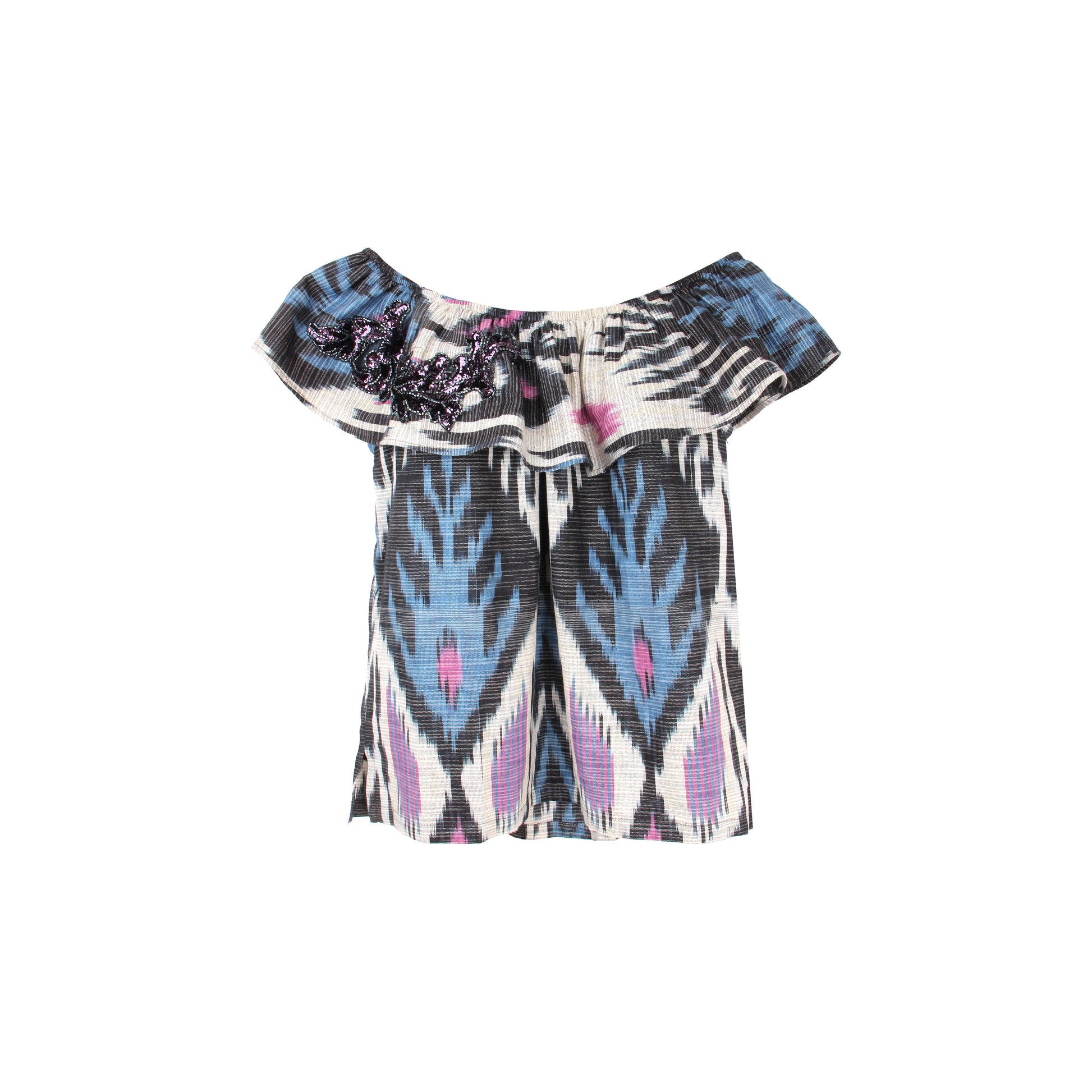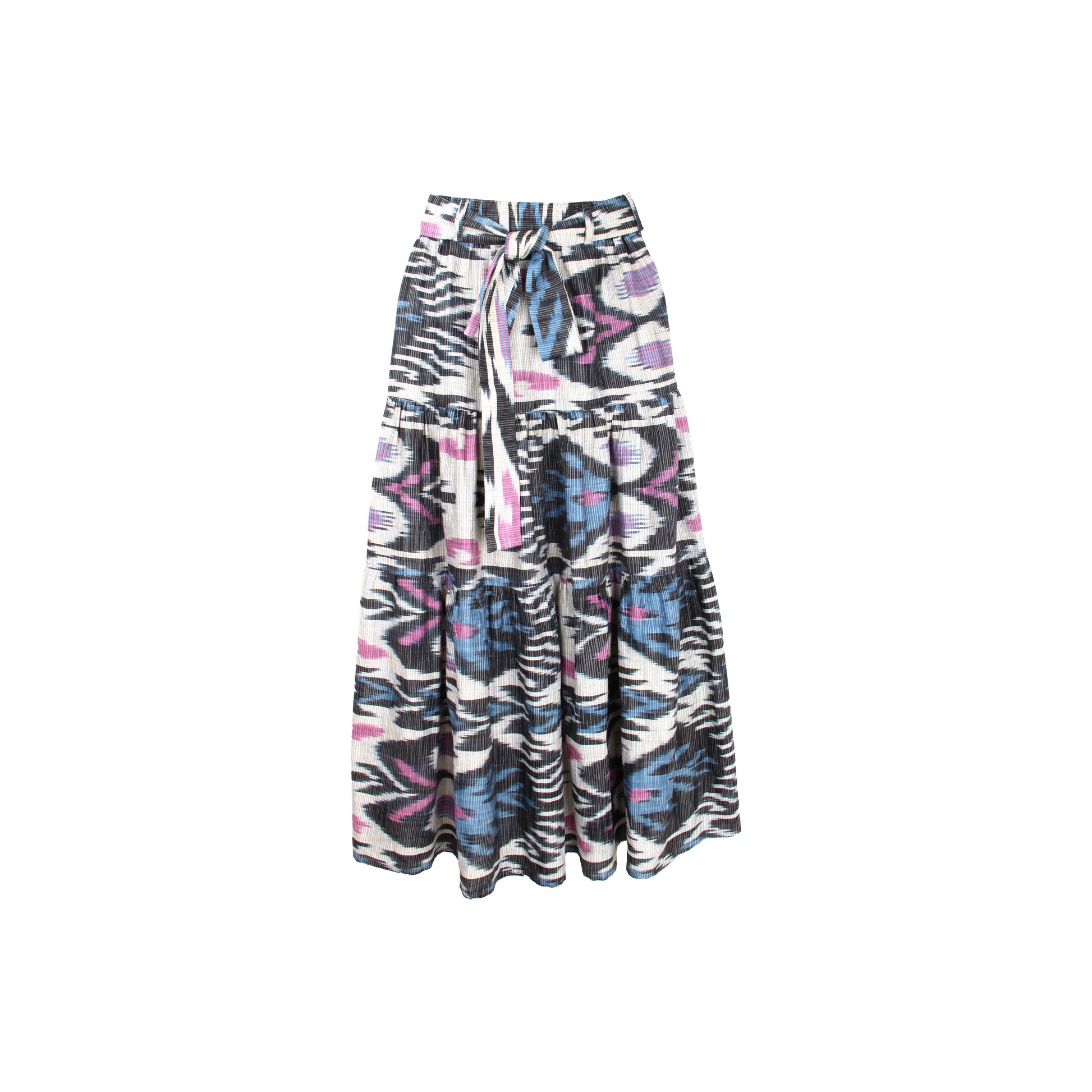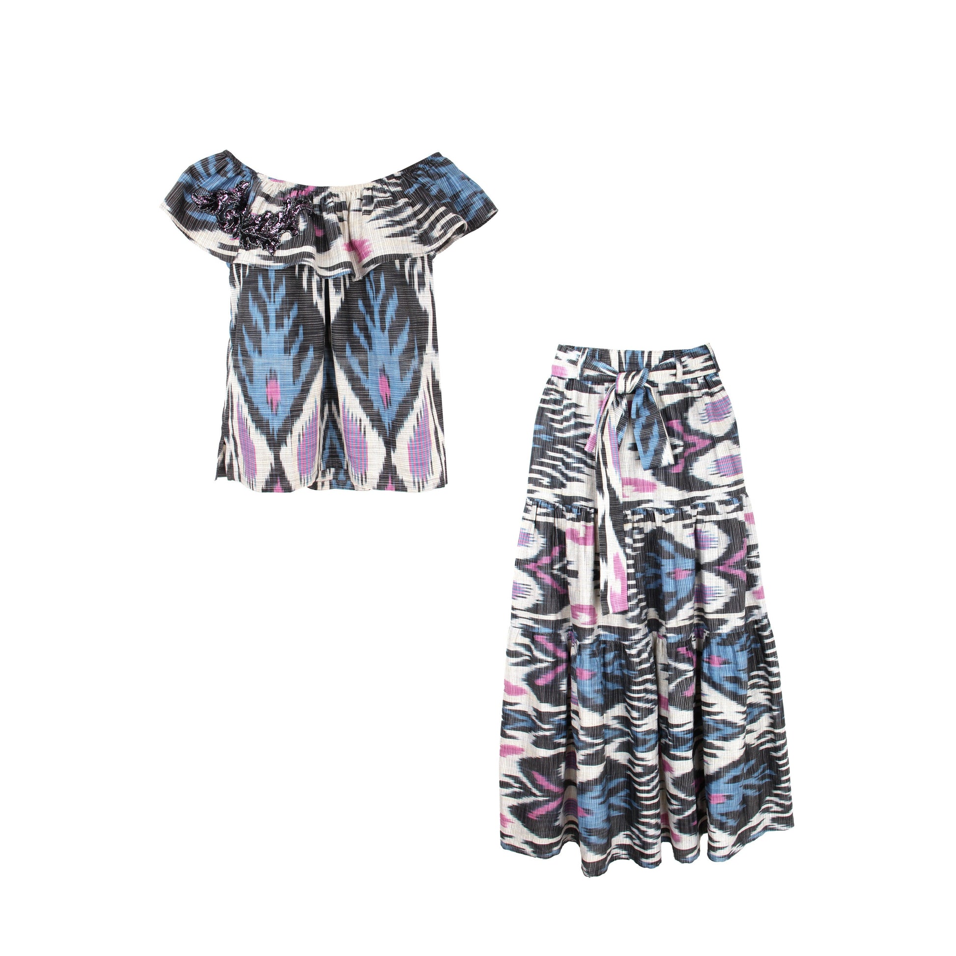 This refined two-piece ensemble is crafted from premium cotton ikat fabric, blending traditional weaving artistry with contemporary elegance. The blouse and skirt are enriched with delicate hand-crafted details, each element showcasing exceptional craftsmanship and authentic cultural character.