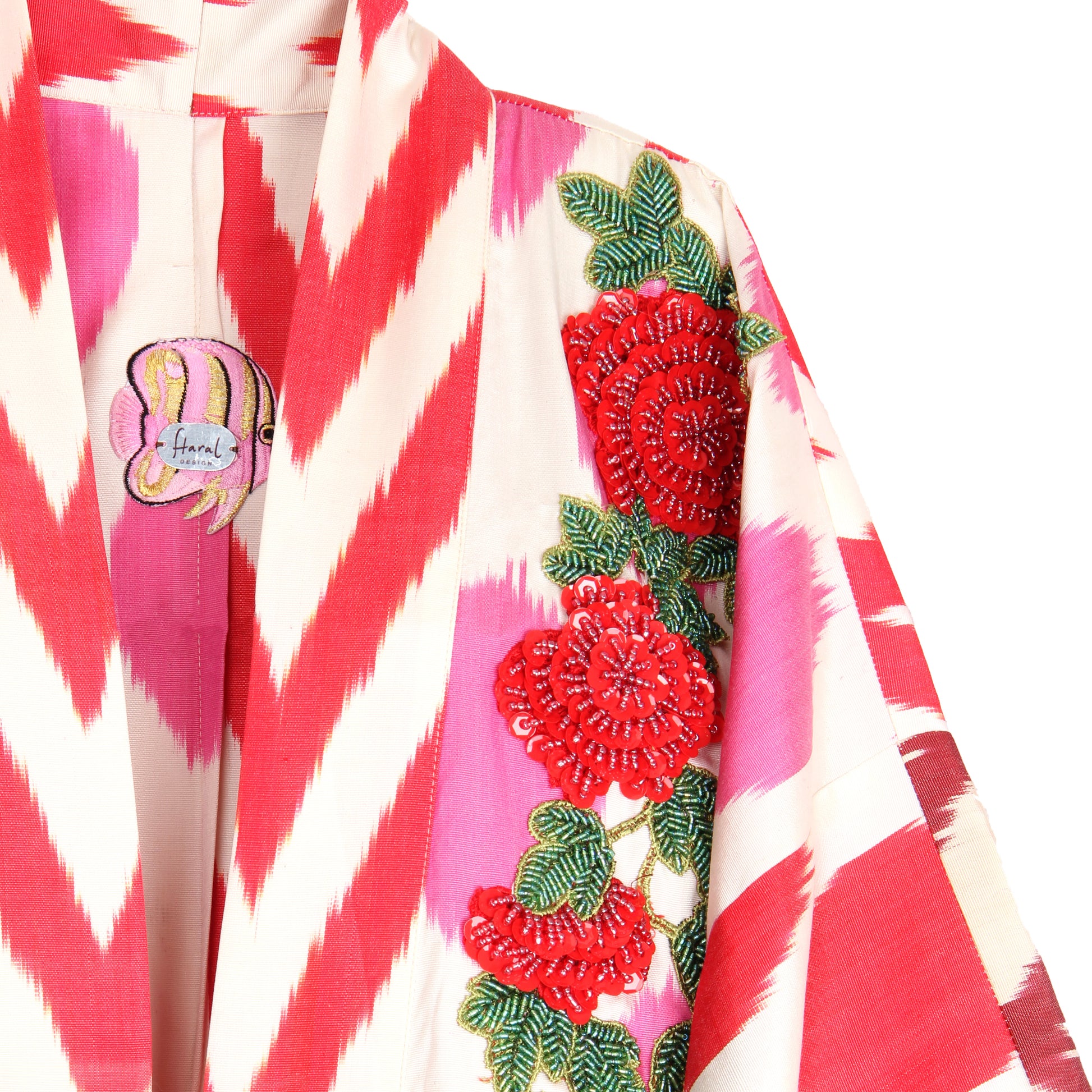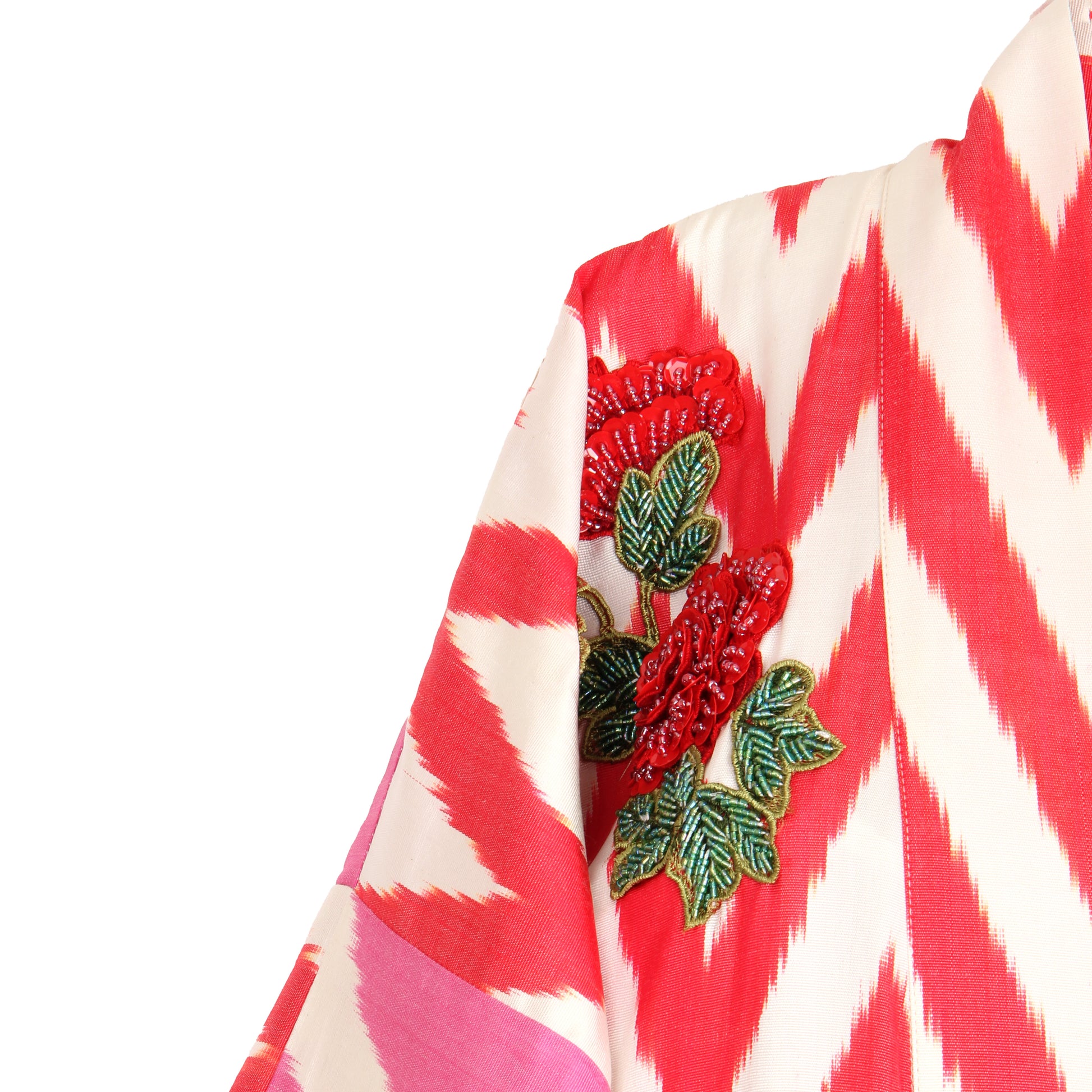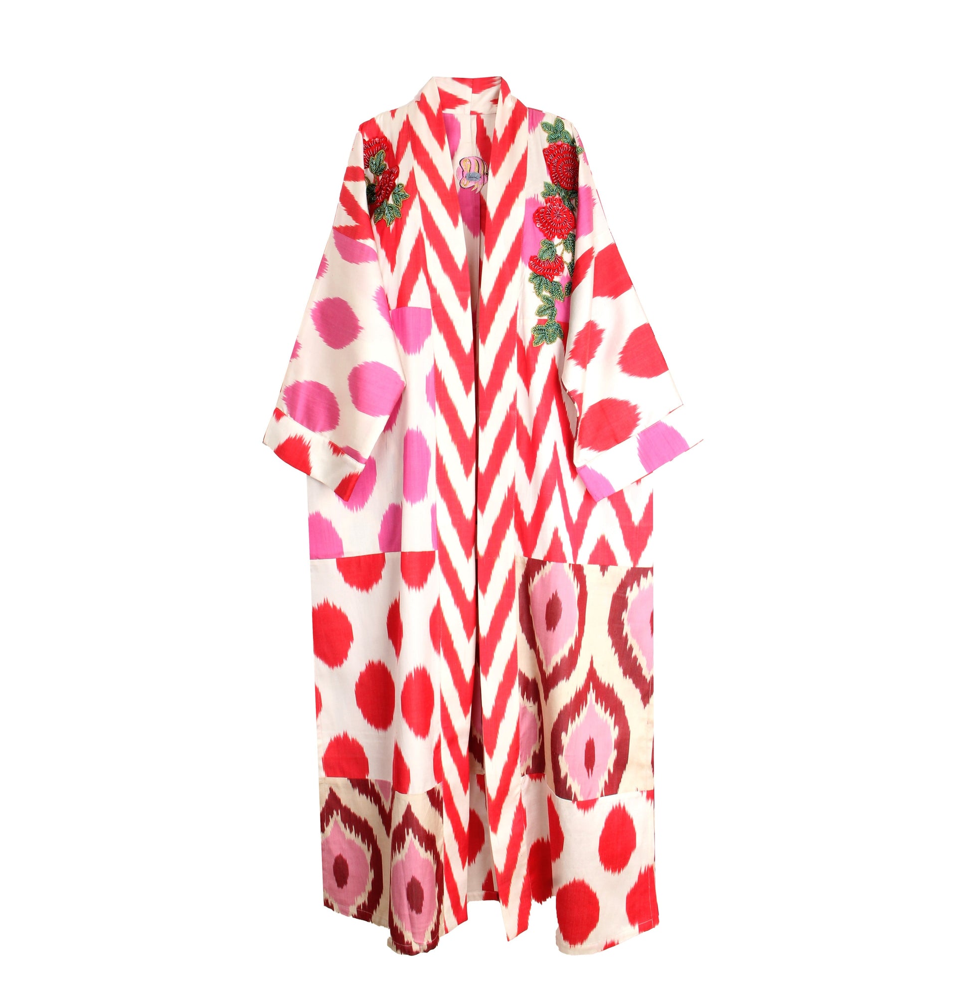This exceptional ikat silk patchwork kaftan is masterfully crafted with intricate handmade details, bringing together the rich heritage of traditional ikat weaving and the artistic charm of patchwork craftsmanship. Each panel is thoughtfully selected and meticulously hand-assembled to highlight the depth, texture, and authentic character of premium silk ikat.