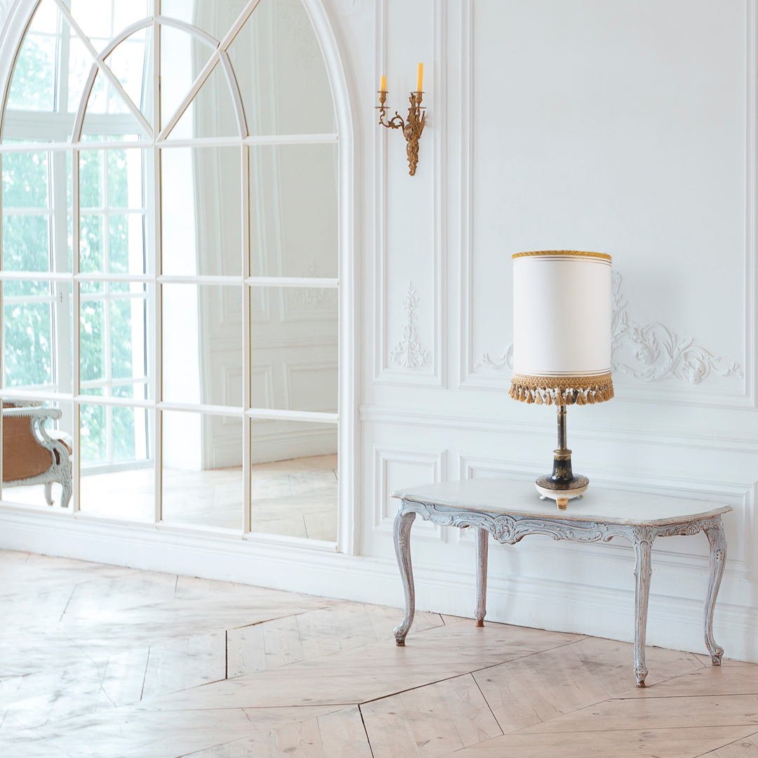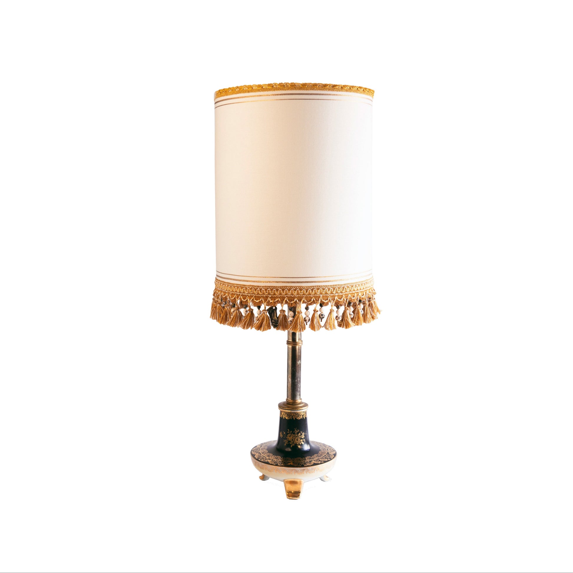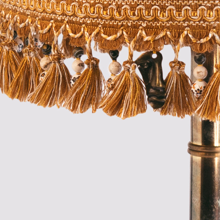 Porselen taban, Fringe'in metal gövdesiyle bütünleşen siyah damga ve altın varaklı motiflerle süslenmiştir.