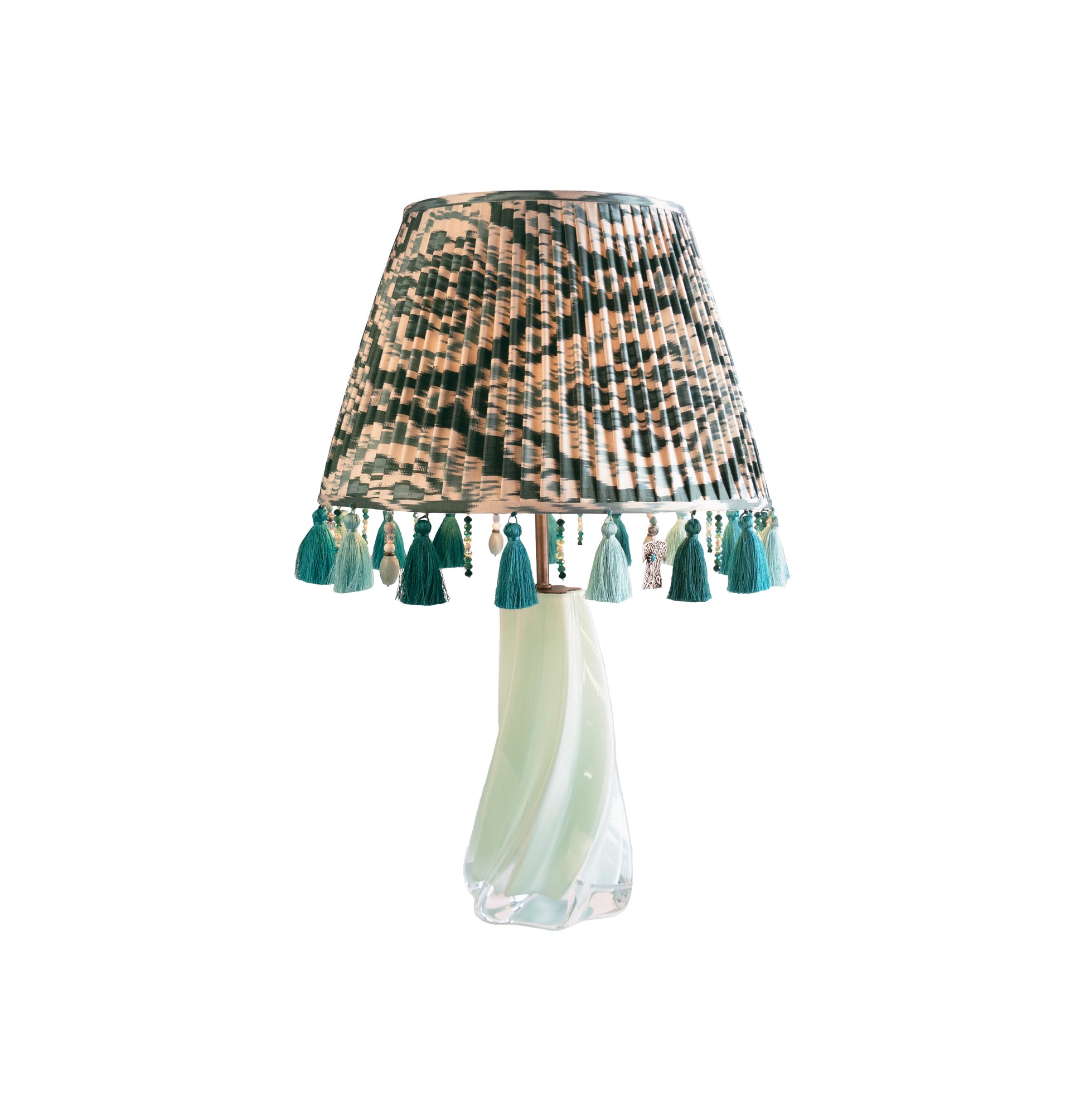 The silk ikat lampshade is adorned with handcrafted beads and tassel details on a glass base. This product is designed as a pair, and each one carries its own unique charm.