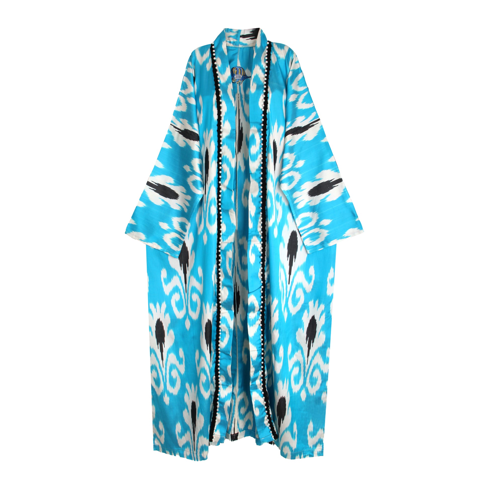 This exquisite silk ikat kaftan is defined by its meticulous handcrafted detailing, showcasing the vibrant artistry and rich texture of authentic ikat weaving. Each element is thoughtfully crafted to highlight the depth, character, and cultural heritage of premium silk ikat fabric.