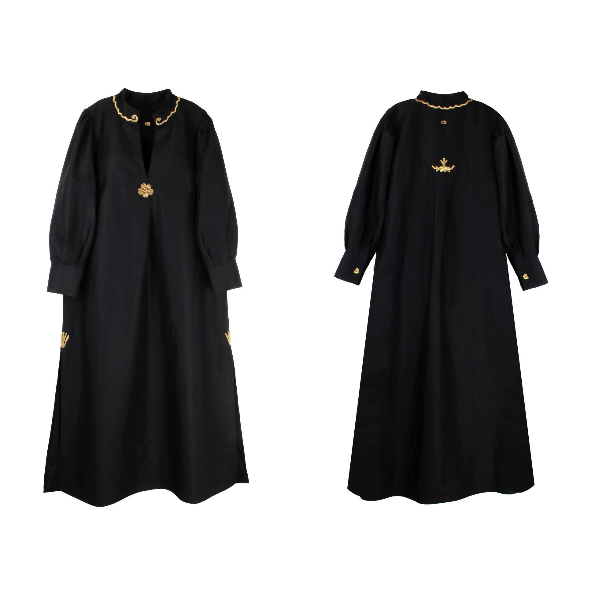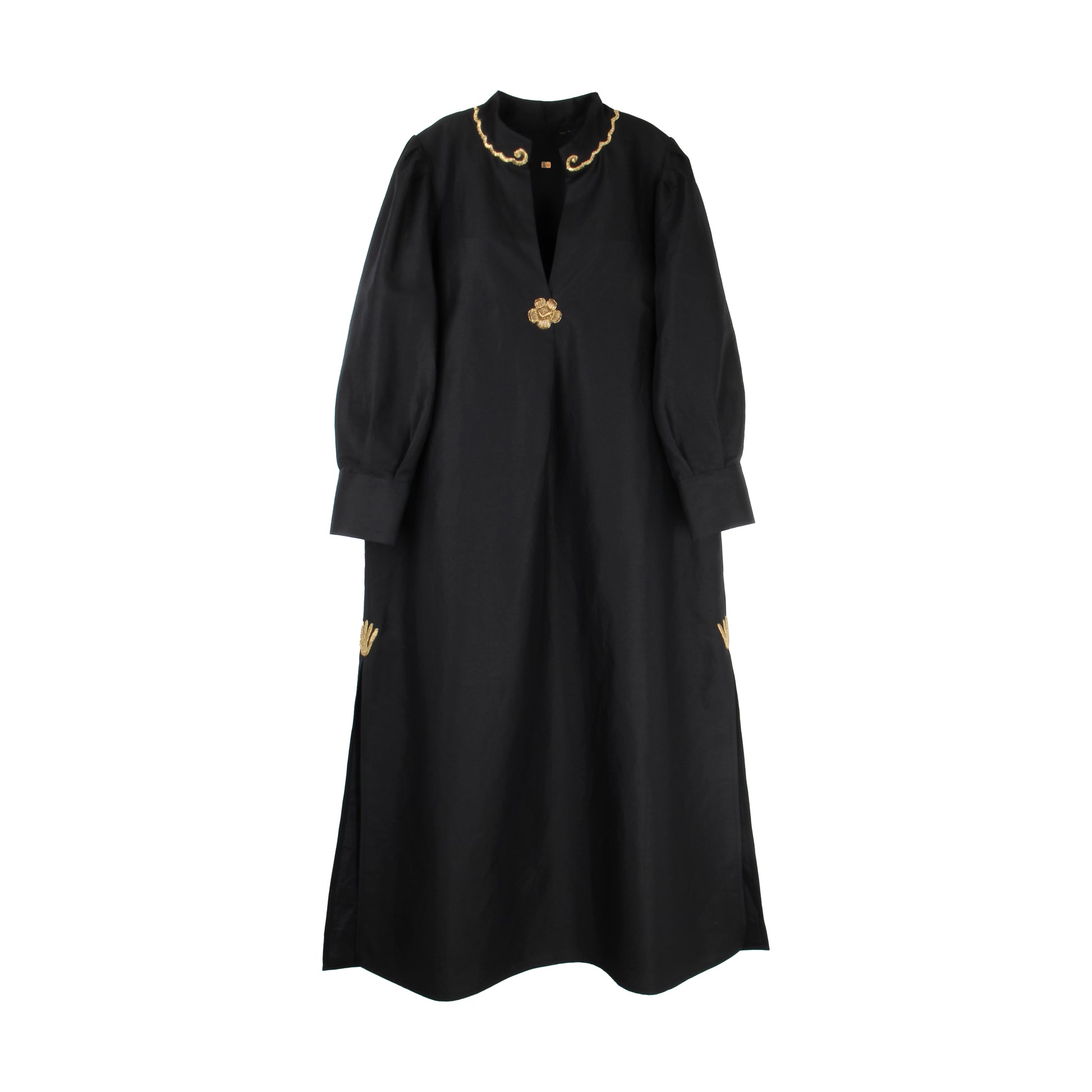 The subtle shimmer of the antique embroidery adds a touch of luxury, making this dress perfect for special occasions, elegant gatherings, or artful daily wear. Combining a minimalist silhouette with intricate detailing, it embodies effortless sophistication.